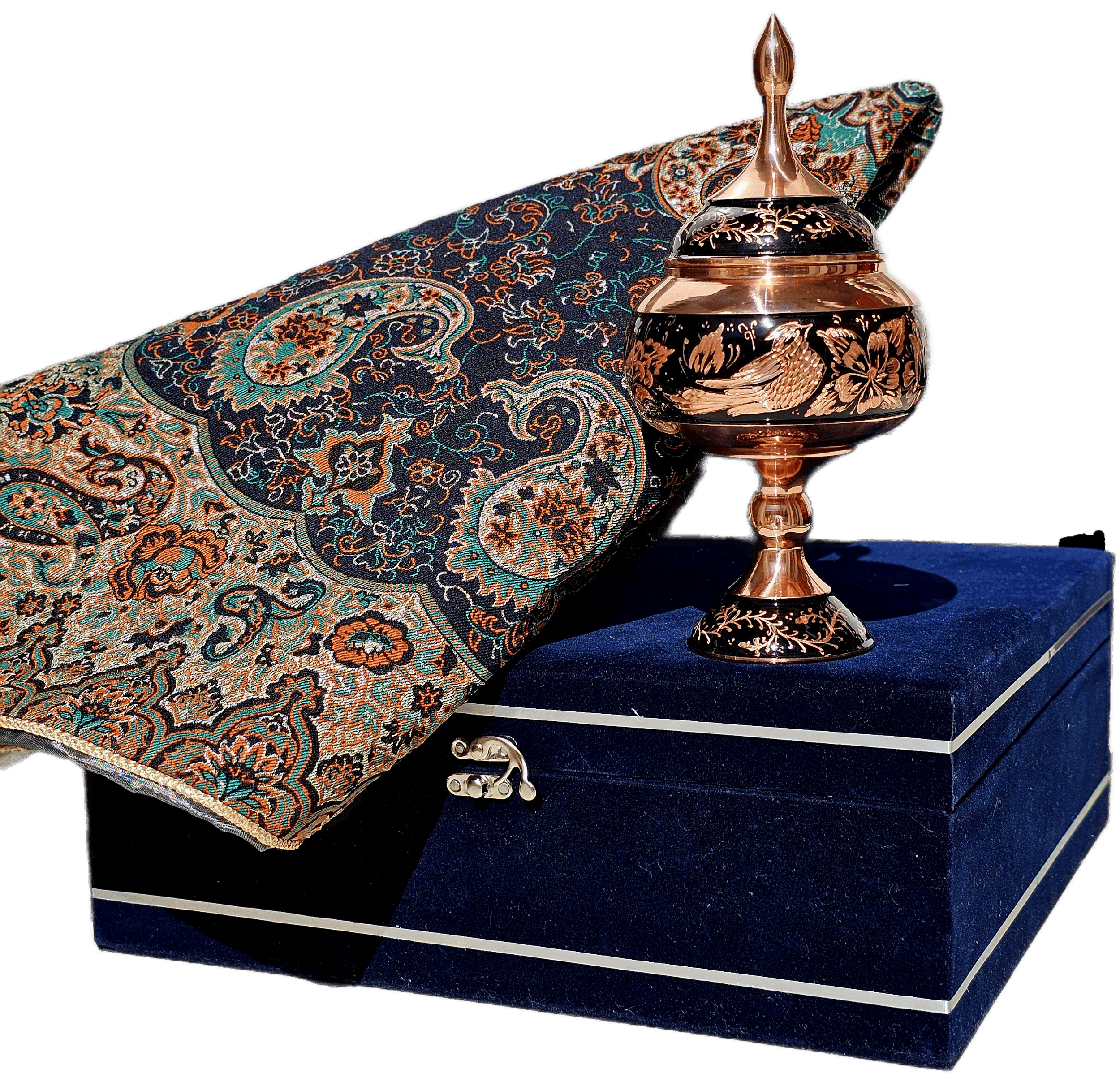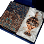 ست هديه مس و ترمه مجموعه اى منحصربه فرد از هنرهاى سنتى ايران ست كه با تركيبى زيبا و هماهنگ، گزينه اى ايده آل براى هديه در مناسبتهاى مختلف به شمار میرود. اين ست شامل يک شكلاتﺧورى با طراحى ظريف و كيفيت بالا و يک رومیزی ترمه به ابعاد 95×95 سانتیمتر میباشد،
